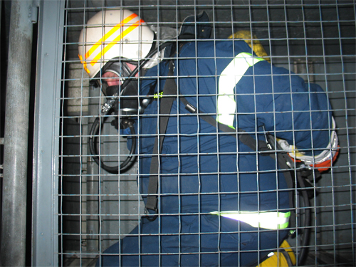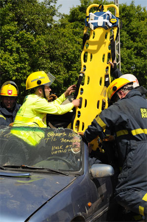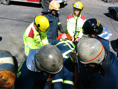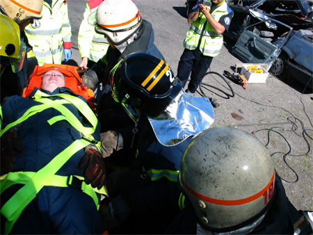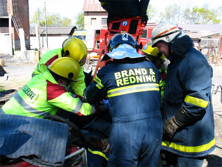 En brandmand kravler ind til "patienten" for at støtte hovedet.