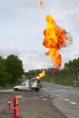 Pludselig opstår en opblussen på grund af vind og udflydende benzin