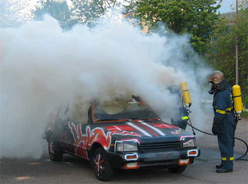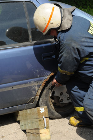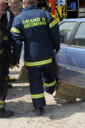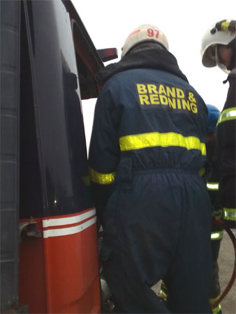 Brandmanden i bilen har hjelm på af sikkerheds grunde.
