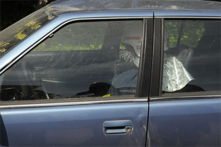 sættes i bilen som figurant