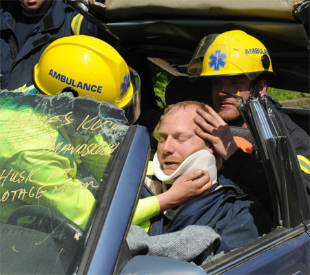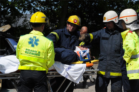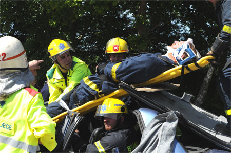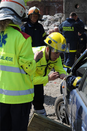 Ambulancefolk tager sig af patienten medens brandfolkene frigører