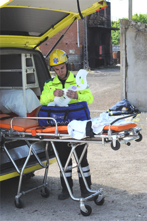 Ambulancemanden gør halskraven klar til "patienten