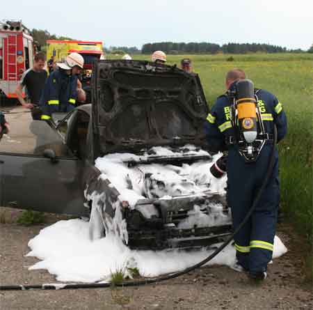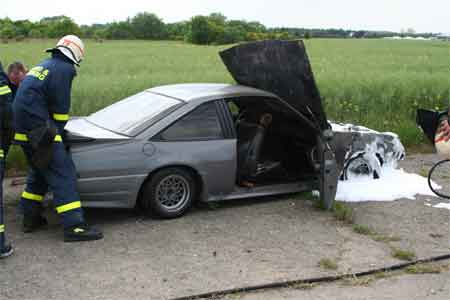 Bilen er skubbet til side og der er lagt skum i motorrummet.